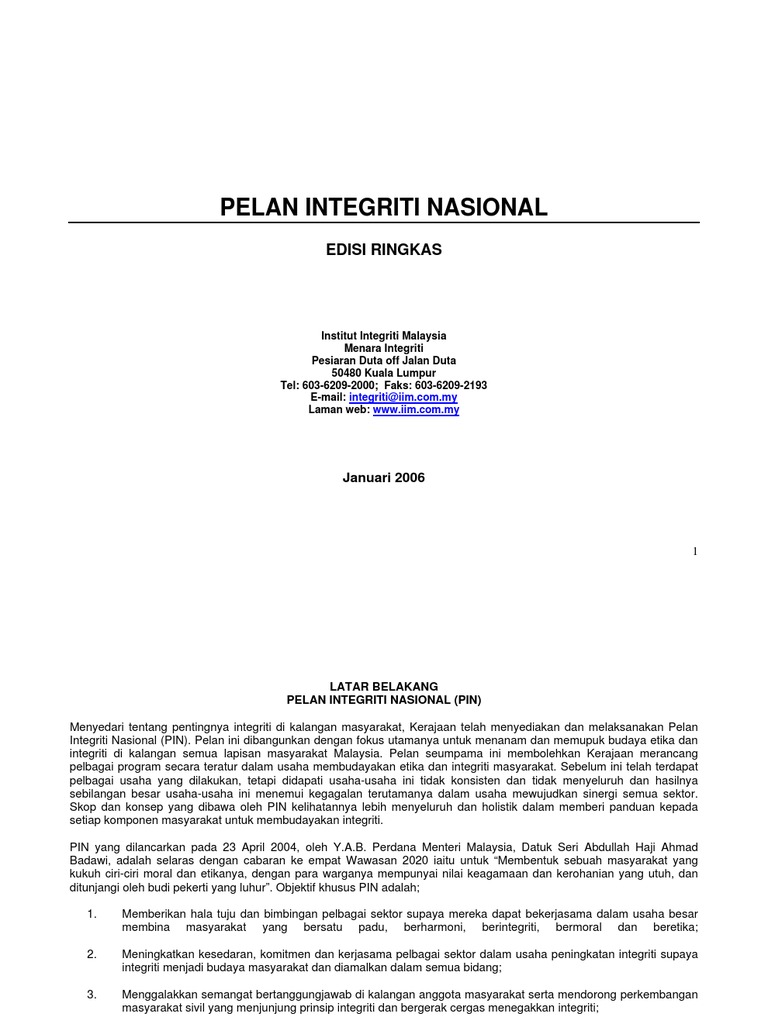 Pelan integriti nasional adalah satu pelan atau rancangan yang dirancangkan serta dilancarkan oleh kerajaan malaysia dengan fokus utamanya untuk menanam dan memupuk budaya etika dan integriti di kalangan semua lapisan masyarakat malaysia. Utama dalam pasukan penggubal pelan integriti nasional (pin) dan. Pelan integrasi nasional (pin)masyarakat memberikan hala tuju dan bimbingan pelbagai sektor supaya dapat bekerjasama dalam usaha pelan ini dibangunkan dengan fokus utamanya untuk menanam dan memupuk budaya etika dan integriti di kalangan semua lapisan masyarakat malaysia. merealisasikan cabaran keempat ,hasrat wawasan 9. 4 tujuan kajian indeks persepsi integriti nasional sebagai suatu.