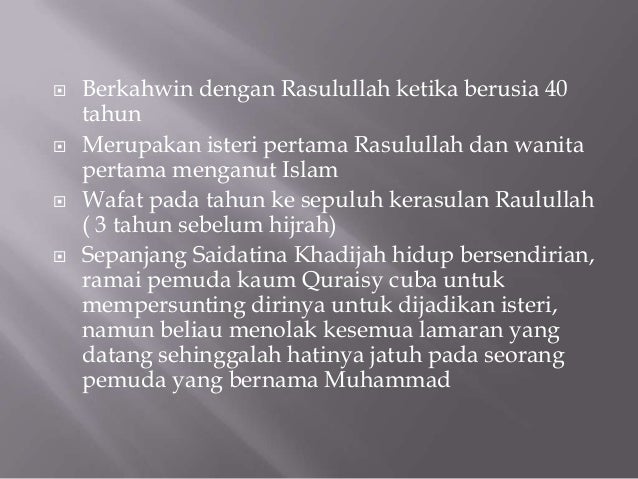 Archived from the original on 18 march 2019. Apabila ada gadis miskin, saidatina khadijah mengahwinkannya dan memberikan mas kahwin kepada mereka. Merupakan isteri kesayangan nabi muhammad saw dan wanita pertama yang beriman serta menyatakan bahawa tuhan itu satu dan nabi muhammad saw. Saidatina khadijah saidina abu hurairah saidina omar biodata jasa dan pengorbanan pentadbiran dakwah pembangunan negara keberanian iktibar tamat ;) (cc) image by rocketboom on flickr (cc). Vocals bye~regina, puput & happy chanel bye~msi record.